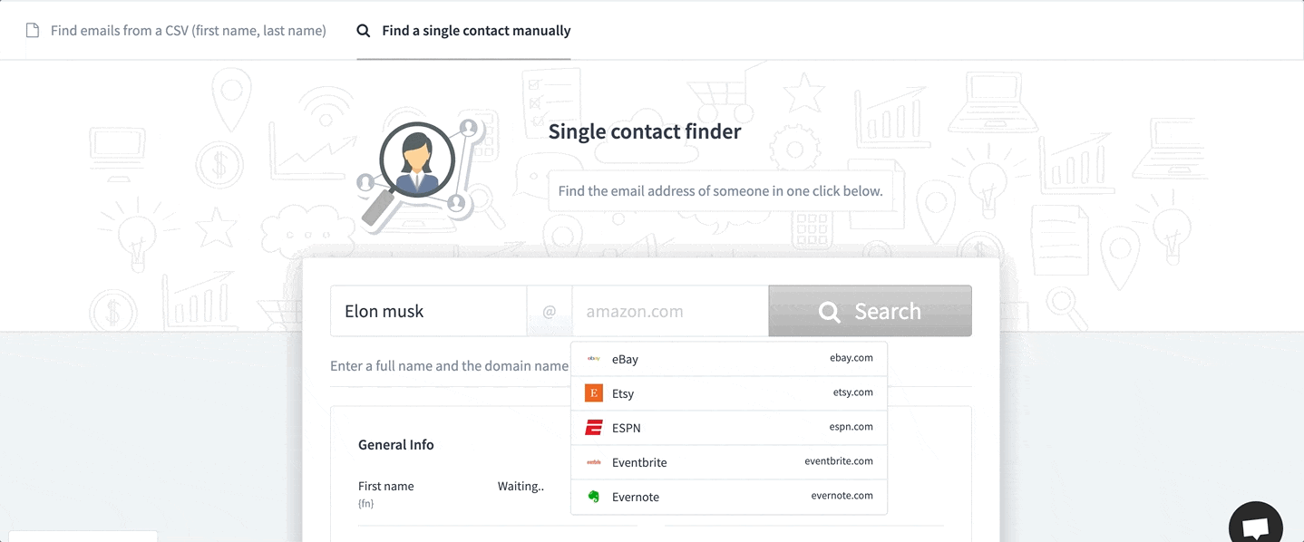 Find emails with just a name + company.- Upload big batch of CSV online to find emails